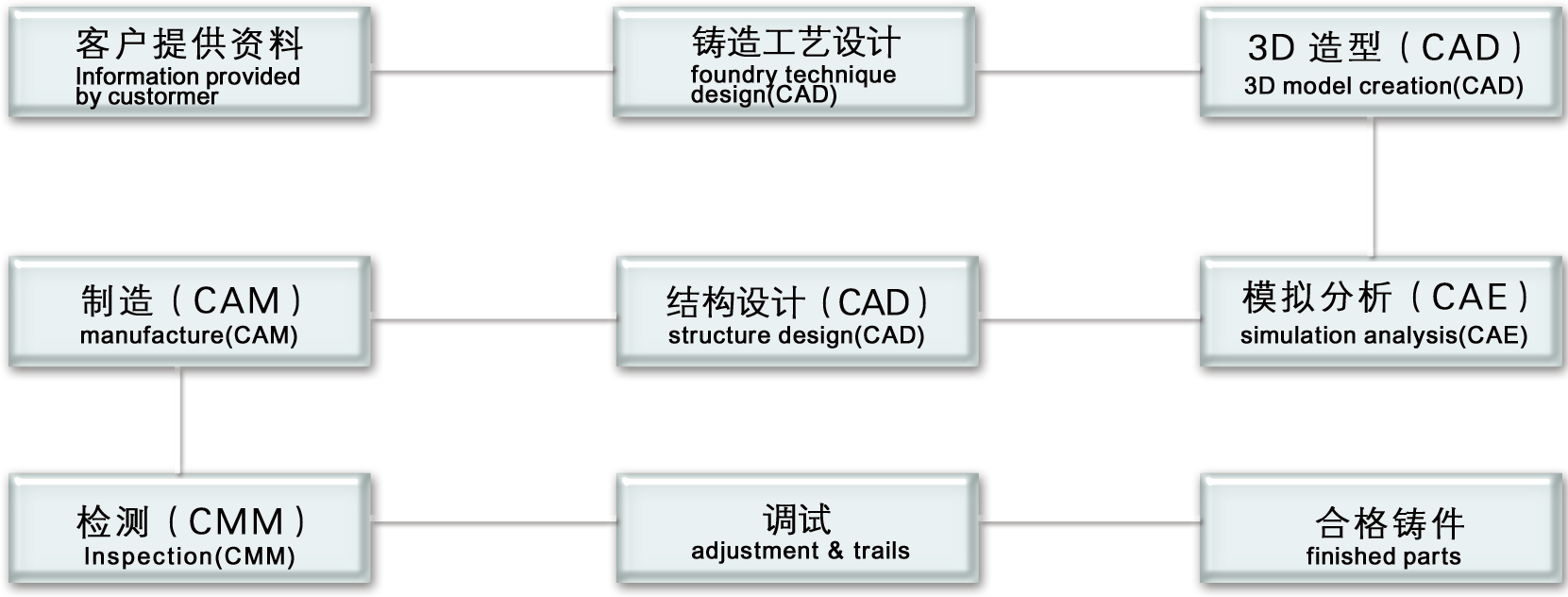 高素質科技隊伍,一流的熱成型、高壓、重力、低壓及黑色鑄造工藝設計、 模具結構設計人員,利用UG CATIA CREO AUTOCAD MAGMA FLOW-3D CIMATON LK/DIMS5.5 METRIS SCCAN4.2等設計、模擬、加工、檢測軟件,為制造一流的鑄造模具提供技術保障。